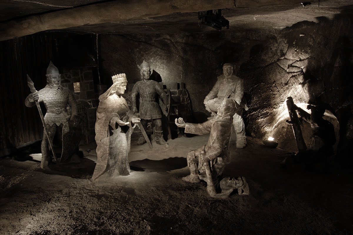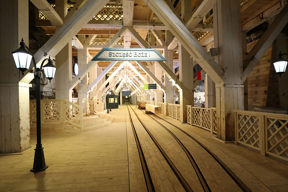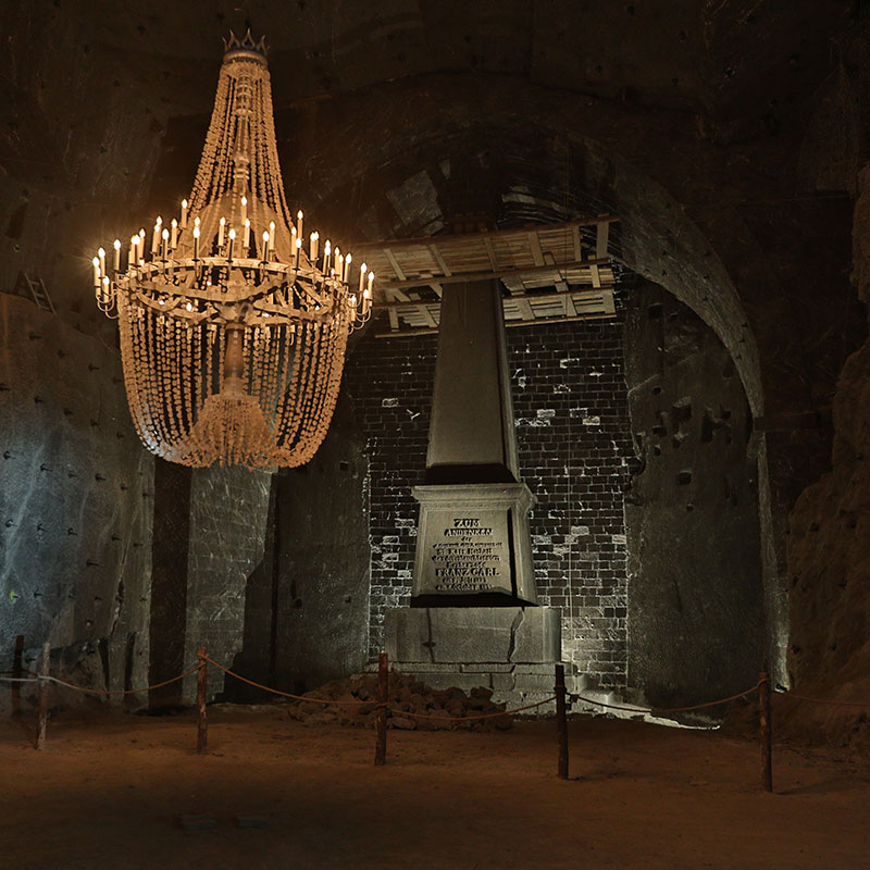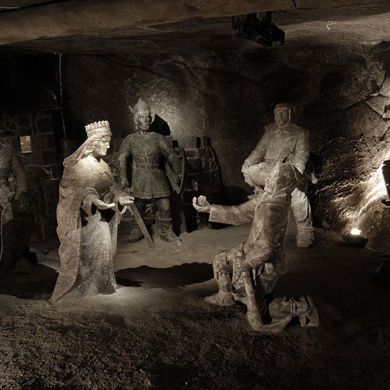 Another omnipresent material in the mine, coming second in quantity after the salt, is wood – here becoming hard like a stone. Carpenters working in the mine have used it, century after century, to build structures supporting roofs and walls of workings (cribs, pillars, wood coating supports). Impressive, massive, 20-30 m high wooden protective lining can be seen along the route, among others in the Michałowice, the Drozdowice and the Piłsudskiego Chambers. Another sign of miners’ activity underground will also become visible, being a display of their religiousness and commitment to tradition. Many places of worship are to be found on the route – chapels with beautiful altars, bas-reliefs and freely standing sculptures with religious, historical or legend-related content, sculpted in salt and in wood in the course of the last 300 years. The heart of the mine is the Chapel of St. Kinga, a masterpiece of art which the guests will see on the 2nd level. It is the only consecrated underground church in Europe devoted to the patron saint of salt miners. All adaptation works in the chamber exploited in the 19th c., and also architectural and sculptural works conducted in the years 1895-1963, were carried out by a few dozen people. You will be mesmerised by religious bas-relief sculptures, huge chandeliers made of natural salt crystals, floor made of polished salt and intricate figures.