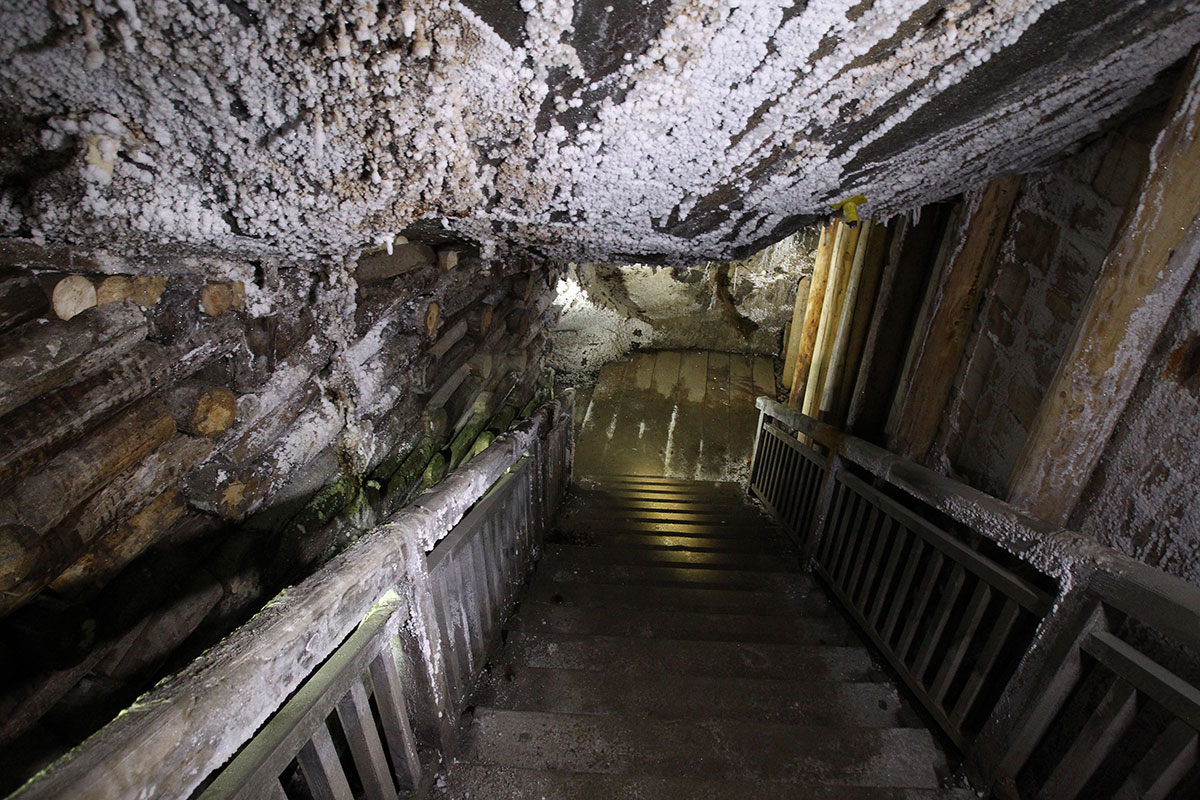 The tourist route is going to start on the first level of the mine, at the depth of 64 metres. On the route, the guests will see excavations in the lump and bedded deposit, mined in the period between the 17th and 20th c. The guide will acquaint the guests with the history of the mine and the most important aspects of the facility’s operation. He or she will also tell legends and speak about curious facts connected with the mine. When going along galleries and drifts, descending spiral stairs, or walking through vast chambers, the guests will be surrounded by salt in all shades of grey, black and white. It is worth paying attention to tectonic properties of the deposit, arrangement of the salt layers, texture of particular clusters and of single crystals of salt, as well as to salty dripstones, which are a result of secondary crystallisation. Traces of old mining work, visible on the walls and side of works, are also interesting. In many chambers, for instance in Urszula, Spalone, Sielec, Pieskowa Skała, the guests will familiarise themselves with the methods of salt extracting used throughout the centuries, and with selected aspects of miners’ work. They will have a chance to see the tools they used and the devices utilised for transporting and lifting salt from the mine.