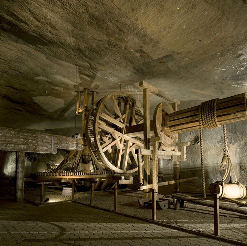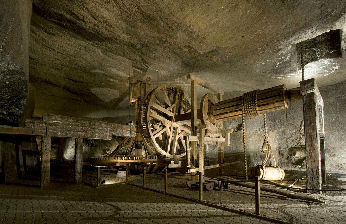 The most of the museum surface is taken up by old tools and mining equipment. All of them are original and derive from the mine. Here, the guests will become acquainted with salt extraction methods: from simple wedges and pickaxes to monstrous electric drills. They will also follow the evolution of mining transport: from carrying salt by hand in niecki (troughs) and płochy (backpacks made of lime tree bast or hemp), by Medieval diggers to Siemens traction engines from the 20th century. Your attention will definitely be attracted by the massive horse-drawn treadmills from the 18th and the 19th century and remaining devices used for vertical transport of salt: wheels, crosses and winches. The guests will also see how the mine was lit, aired and de-watered in different ages, how fires were extinguished and how people tackled other types of danger. The exhibits are accompanied by drawings and models by the founder of the museum, Alfons Długosz, which illustrate their application.